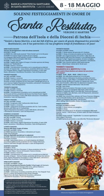 - May 17 2026In onore di Santa Restituta, manifestazioni e incontri si susseguiranno a partire dall' 8 maggio, sino ad entrare nel vivo nei giorni 15, 16, 17 e 18 maggioSun 17 May 2026 Ore 09:00 - until Ore 23:59Categories: